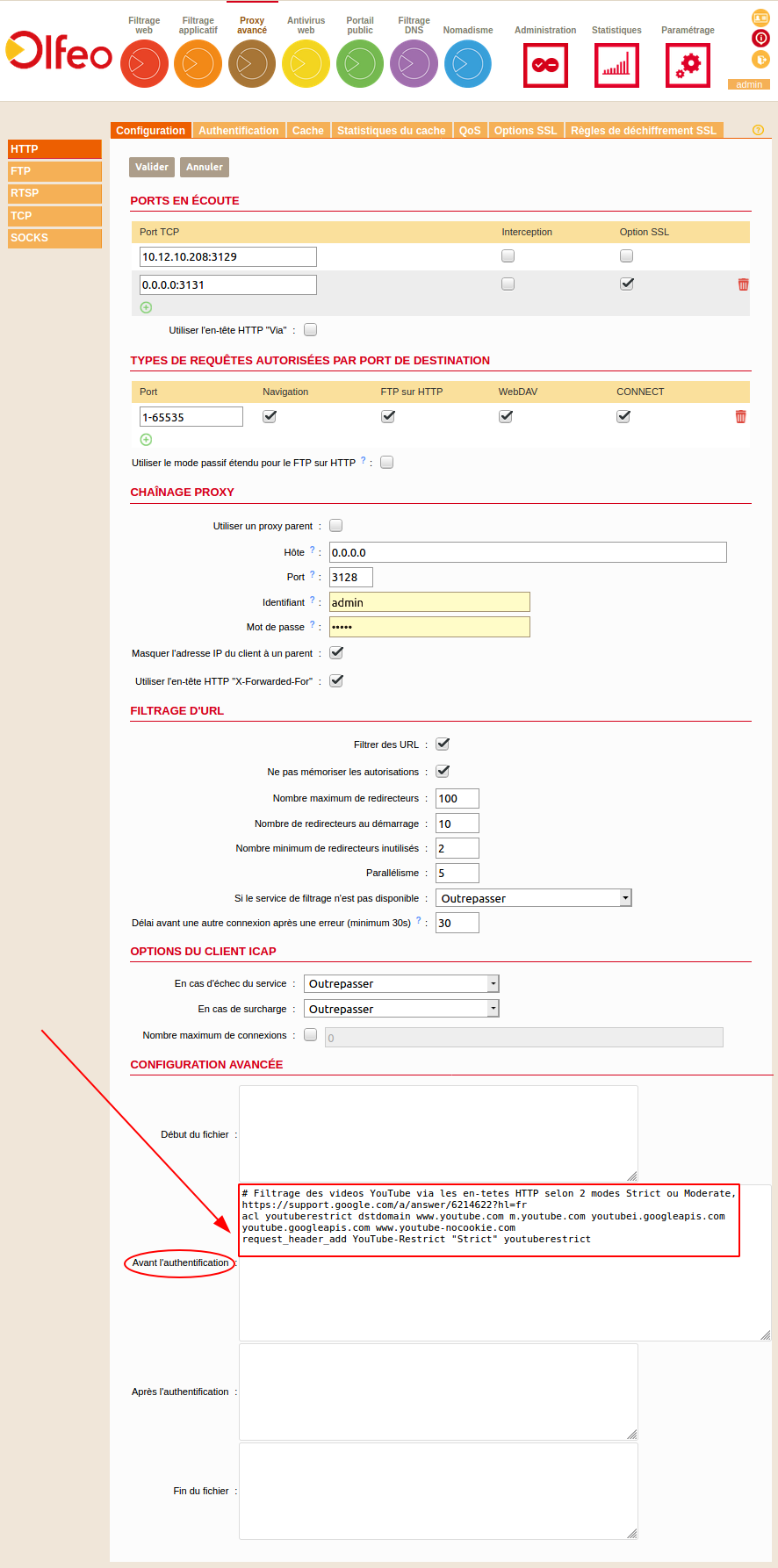 Dans la Webadmin, menu Proxy Avancé>HTTP>Configuration>Configuration avancée>Avant l’authentification, coller l’ACL suivante :